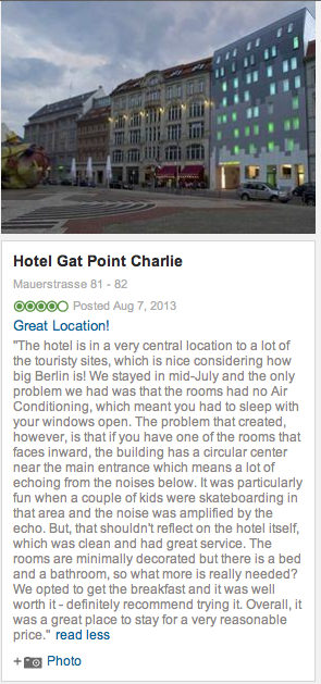 Is the WiFi is free or not? (And if not, how expensive and reliable is it?) What is the parking situation? (In Europe, it’s like hitting the jackpot when you stay at a hotel with free parking.) Are toiletries offered or do you need to bring your own? Is the room clean, and if not, what has made you deem it “dirty?” If it’s dirty, don’t just say it’s dirty. Tell the reader why and if possible, include a photo. If the hotel offers a parking lot that you have to pay for but there is a cheaper garage across the street – note that as well. This is also the area to tell the reader if they should request one room over another. In European cities, there can be a lot of street noise, so more often than not, you want to ask for a room not facing the street. Or you want to ask for a higher level room because there may be a better view. These tips help out other travelers in determining whether or not the hotel fits their needs right off the bat!