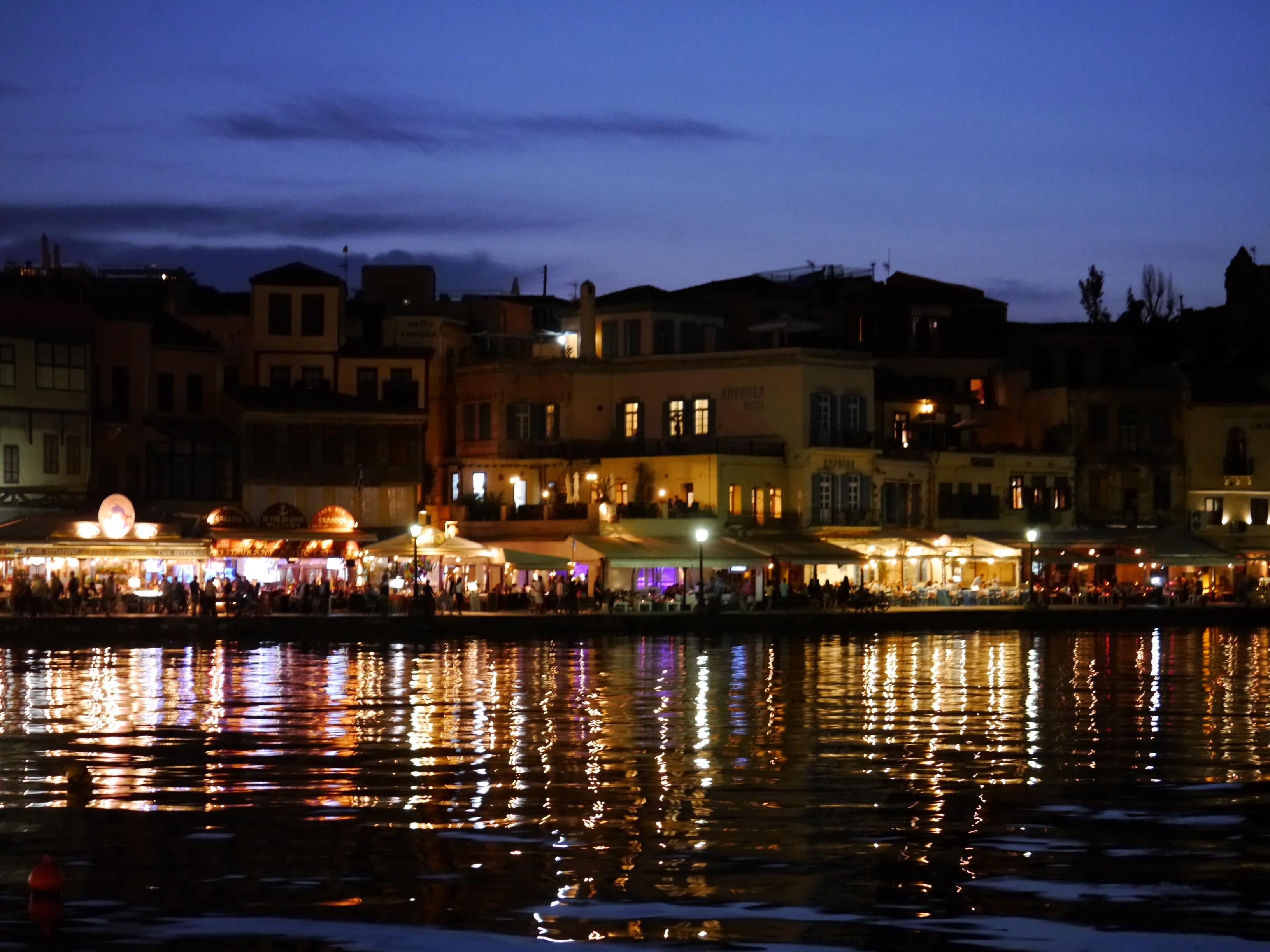 We arrived into Chania pretty late in the evening, and while the taxi would have been quite expensive, we opted to wait for the bus to take us into town. Luckily, our hotel was about a five-minute walk to the bus station, so we had no problems getting to our hotel. (One clue that Crete was going to be a fairly inexpensive place to visit should have been that we paid $220 for three nights at our hotel, which included breakfast and a two-room suite with a huge balcony overlooking the harbor. It was awesome!)