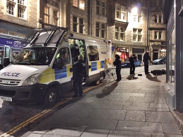 Day one ended with a bit of excitement. During dinner, we heard the non-stop buzz of a helicopter and on our night walk, noticed one of the main roads was blocked off and police in riot gear were all over the place. Being nosy, and aided in the multiple Closes, John and I made our way down to the center of excitement – apparently, a man with a gun (unheard of in Edinburgh) was running from the police and was on top of the roofs. We waited with the crowd for some conclusion but 90 minutes later, we gave up. (A good thing too, because apparently the guy was not caught until the early am…I was not waiting in the cold that long!)