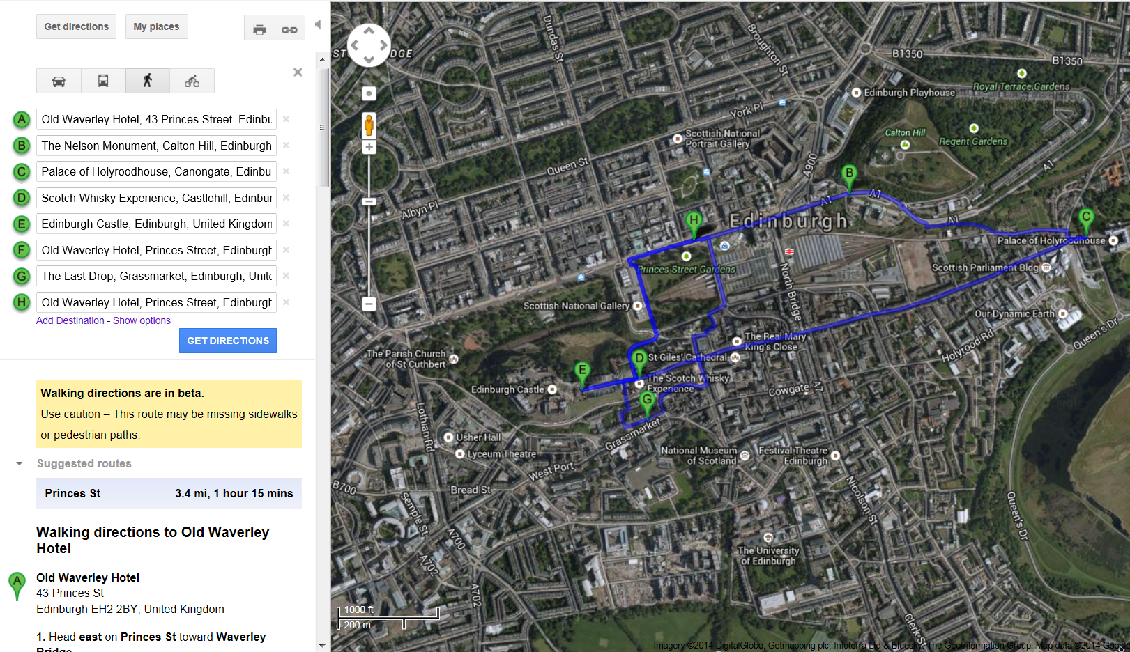 Edinburgh is not a huge city and could easily be done in 1-2 days (more if you are big into museums), so I worked out a plan for us that was actually leisurely while hitting most of the highlights. One of my new favorite ways to work out a trip plan is to use Google maps to work out a sight-seeing route. Day one looked like this: